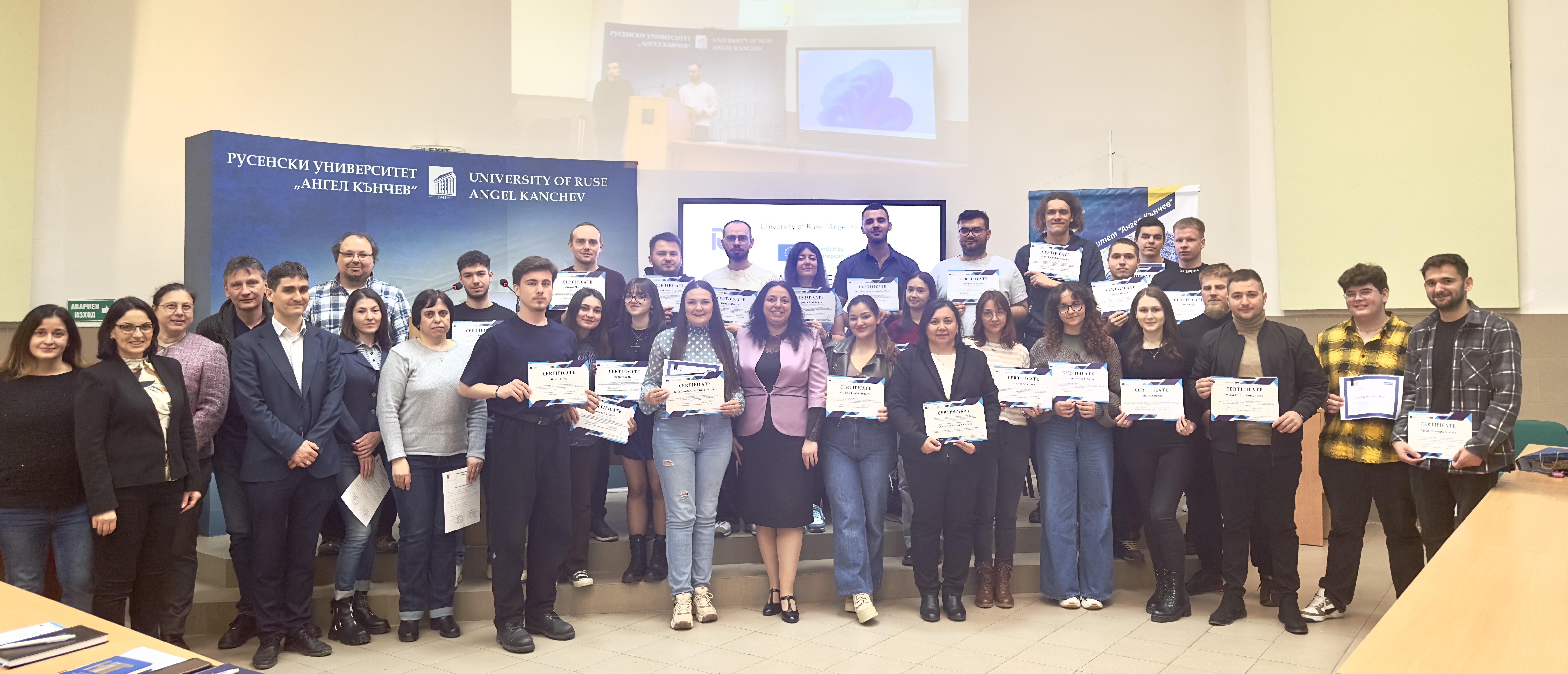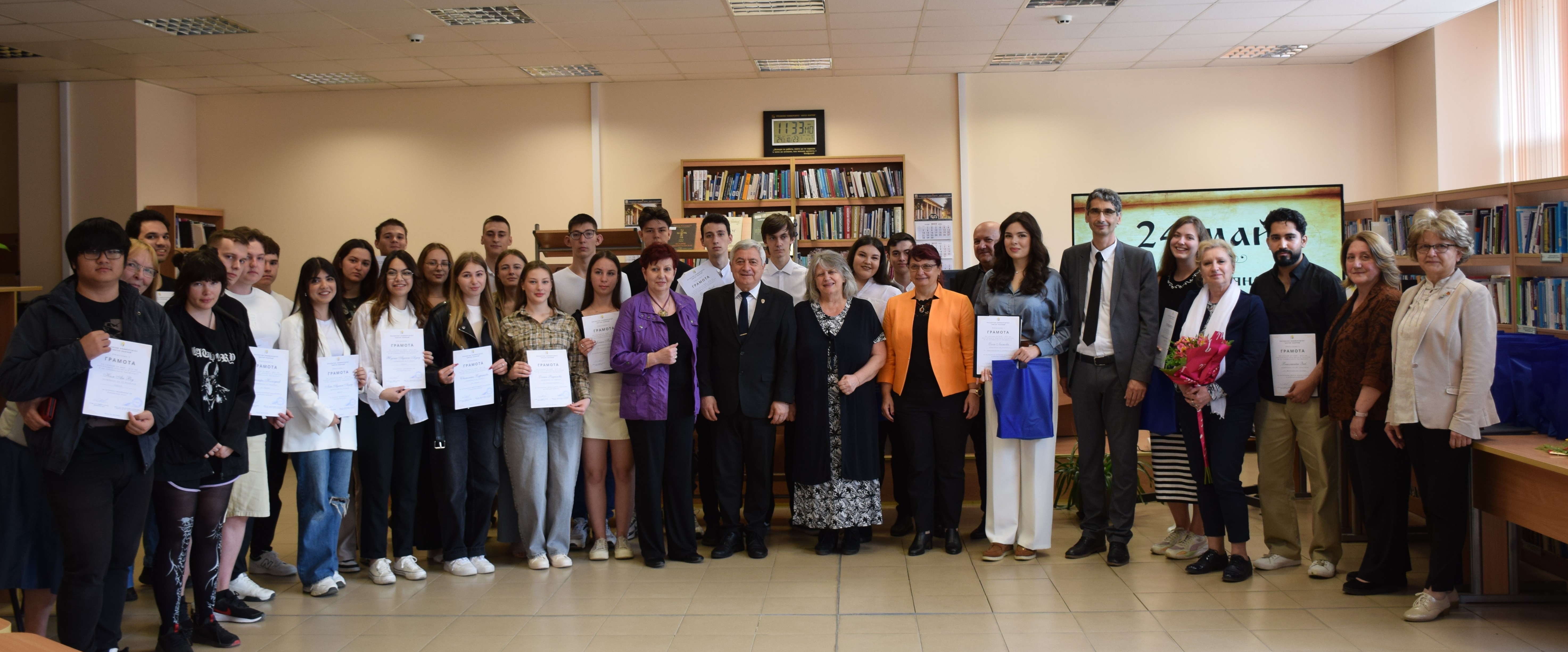 The certificates were presented to the teachers by Academician Hristo Beloe, DscEng - Honourary Rector and Chairman of the General Assembly of the University of Ruse, and the Rector of the University of Ruse, Associate Professor Desislava Atanasova, PhD handed out the certificates to the students. The event was attended by lecturers from the departments of "Bulgarian Language, Literature, History and Arts" and "Foreign Languages".